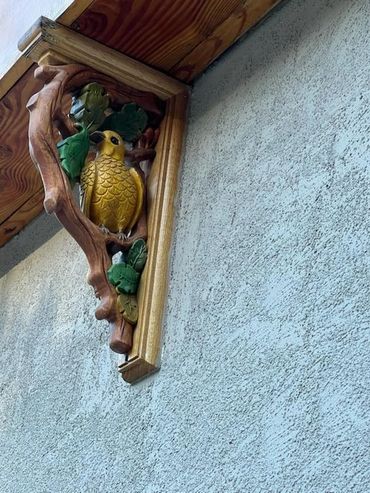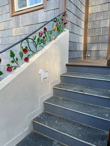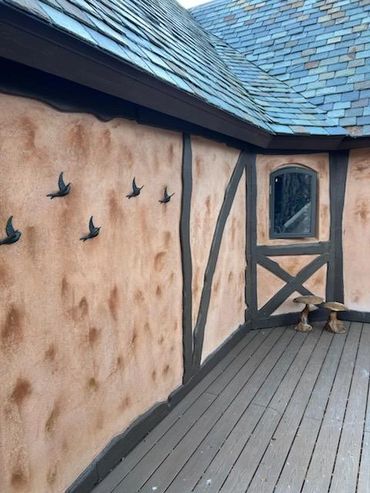 There are at least 9 hearts built into the buildings. Or is it the bird house? There are 4 bird corbels, a bird knocker, key holder, and others. Maybe it’s the house with the slate roof. Or the house built around the tree. Call it whatever you like! The house will be getting a name soon, and a nameplate to designate that, similar to storybook style houses in Carmel by the Sea. Top name choices so far are “Key to my Heart” and “Heart’s Whimsy”.